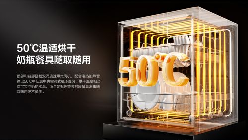 然而评价一款好的消毒柜,除了关注消毒杀菌能力,消毒烘干温度和消毒速度也不能忽略。过高的温度容易导致奶嘴变硬、餐具变形,加速有害物质析出,因此在选择时应尽量避免采用高温方式消毒的产品。老板光剑消毒柜XS827采用光动力低温快消科技,平均消毒温度只有50℃,烘干则是通过顶部和背部搭载的双涡旋速烘大风机,配合电热加热管,输出中低温循环暖风,平均烘干温度维持在50℃,使其更适合对奶瓶等特殊材质餐具消毒。