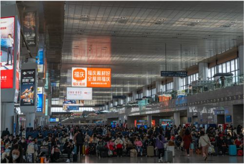 自2022下半年伊始,福庆在全国各地开启全新高铁广告投放战略。2023年3月『福庆板材好 全屋用福庆』超清巨幅广告已强势登陆亚洲第一大高铁站——南京南站,与数以亿计的高铁乘客会面!