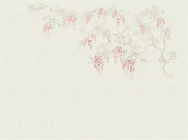 紫藤花一串串连在一起,代表着对爱人连绵不断的思念,是一种美好的憧憬。植物叶子碧绿生辉,枝子线条有着非常浓厚的艺术气息,用金属丝线绣制,在阳光照射下闪闪发光,给室内空间送来了平安和幸福。