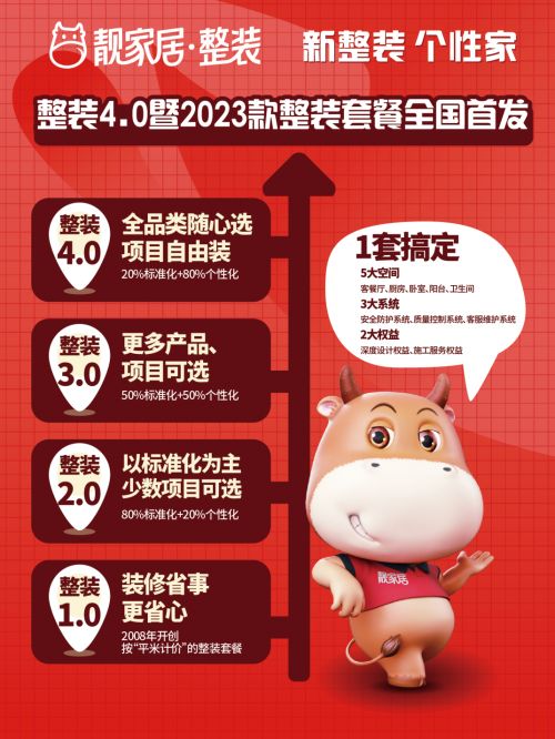 为匹配消费者多元化的装修需求,今年,靓家居重磅发布“整装4.0”暨2023款整装套餐,相比整装3.0的“50%标准化+50%个性化”,整装4.0在装修基本标准配置上实现80%的个性化,旨在最大化消费者可个性选装的范围:装修设计风格多样化、软装硬装家电个性搭配设计、整装全品类个性选配、施工项目个性化,让新家装出个性范、新潮范,满足消费者对家的所有想象。