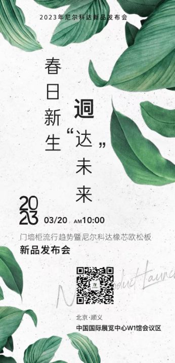 3月20日上午10:00,欢迎来到北京顺义中国国际展览中心W1馆会议区,聚焦“春日新生,迵‘达’未来,2023门墙柜流行趋势及尼尔科达集团橡芯欧松板新品发布会”,倾听关于趋势发展的深入思考,坚定创造中国美好人居环境的信心。