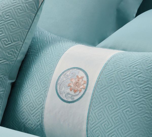 水星家纺的竹韵江南系列,在细节工艺设计方面也是颇为讲究,枕边与被面以宽边进行拼接,同色系微明度对比能够更好地彰显出竹韵的主题,刺绣方面结合了白墙黑瓦、竹影透窗的意境进行设计,给人以一种置身江南园林中的惬意感。