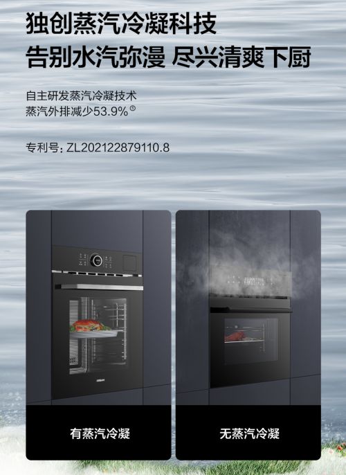 过去,用户在使用蒸烤炸一体机的过程中,蒸汽外排一直是个问题,一不小心水汽弥漫,不仅会打湿橱柜,而且极容易烫伤脸部或水蒸汽喷射到腿部。水汽出现的原因,在于蒸烤炸一体机蒸制食物时,腔内会排出大量水蒸汽,就像蒸锅蒸菜时不断外溢的蒸汽。为了规避隐患,老板电器自主研发蒸汽冷凝技术,它就像自带了一个“小空调”,可将腔内过量蒸汽快速冷凝,相比普通蒸烤炸一体机蒸汽外排可减少53.9%,让你下厨时可以远离水蒸气。