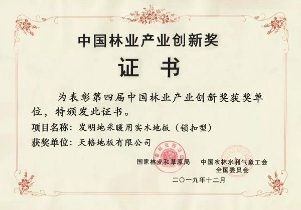 直到2002年,天格整合虎口榫锁扣、六面全防涂饰、静音消声等多项专利技术,成功发明地暖实木地板这一全新品类,为地暖用户提供了同时兼顾环保与稳定的地面材料,一举解决了市场困境。此后,为不断提升产品品质,天格也致力于不断完善地暖实木地板的工艺技术。2011年,天格在行业内首次推出《地暖实木地板系统解决方案》,这一方案将地暖实木地板从单一的产品升级为一整套系统解决方案,并成为当今地板行业最为主流的技术流派,将地暖实木地板升级打造成健康、耐用、易打理、可重复拆卸使用的高品质地面材料,极大提升了用户的居家生活幸福感。2017年12月,天格凭借“将实木地板应用到地暖环境的方法及实木地板铺装结构”专利,荣获第十九届“中国专利优秀奖”。不仅如此,到目前为止围绕着地暖实木地板品类,天格已发明80多项行业和国际专利,打造了完整的品类技术群。