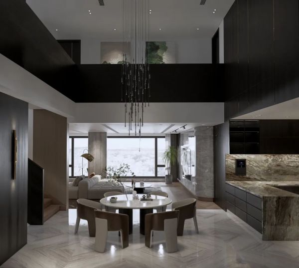 该项目餐厅区和围合休憩区层高接近五米,能让居者从入户开始就融入项目的开阔性视野中,消除了压抑感。厨房与客厅则采用开放式布局,弥补了进门空间不大的不足。同时,设计团队摒弃了赘饰和遮挡物,使得居者能够将整个空间尽收眼底。