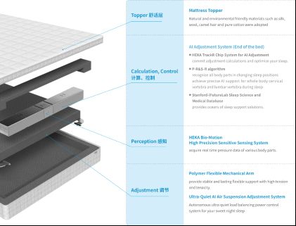 HEKA将人工智能技术革命性地应用到睡眠领域,是当今世界上唯一能够主动适应,并AI支撑人体各部位和身体曲线,在不打扰的情况下,优化颈椎与腰椎的承托,保护血液循环,并保持呼吸通畅。更好的满足了消费者的个性化睡眠需求。
