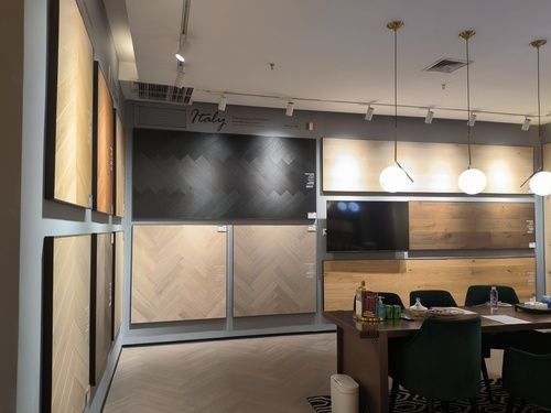 不仅在家能见到安信地板,在商场也经常有安信地板的身影。SKP北京店、西安店,以及最近新开的成都店都分别使用了安信橡木人字拼地板和鱼骨拼地板。地板四周无缝拼接大理石地面,部分区域更是异形拼接收边,这对产品的加工精度和安装精度都有着很高的要求,如果这两项精度不够,公差配合的误差累加,产生错位,都会影响人字拼地板的铺装效果。