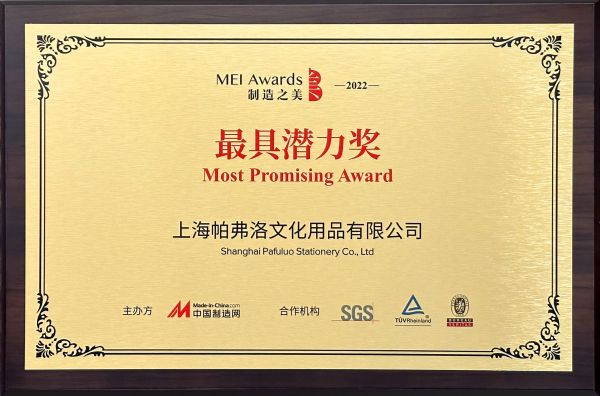 近日,“联结MEI好·2022中国制造之美颁奖典礼”在南京圆满举行,上海帕弗洛文化用品有限公司荣获2022中国制造之美·最具潜力奖全国15强。本届中国制造最具潜力奖获奖词:企业注重品质、坚持创新,产品获得了目标市场的良好销售与口碑,并在自我提升的道路上不断取得进步。