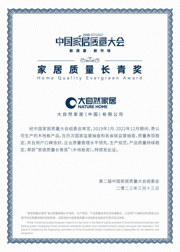 “家居质量长青奖”是对质量管理水平领先、生产规范、产品质量优秀并且持续稳定,以及用户口碑良好的家居企业授予的在质量领域的荣誉,其评选标准也极其严苛,不仅近几年企业不能出现重大质量负面和生产质量事故,且要求企业拥有完善的质量管理体系,质量水平取得突出成绩并达到国际、国内领先水平。此外,本着公平公正的原则,评选方对《2019-2021年家居质量数据研究报告》和《2021-2022家居质量白皮书》中2019年1月至2022年12月时间内,累计61余次关于木地板产品质量国家监督抽查、各省级市场监管部门抽检,涉及到的1466批次木地板的抽检结果进行分析,四年期间内,产品经过国家监督抽查、各省级市场监管部门抽检全部合格,产品质量表现稳定的企业,才能纳入评奖范围。