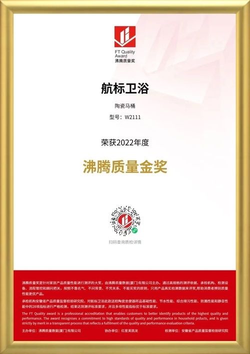 航标卫浴参评的陶瓷马桶(W2111),经过承检机构对其送检样品进行严格检测,结果达到测评标准要求,并且多项性能指标优于标准要求,获得“沸腾质量金奖”。