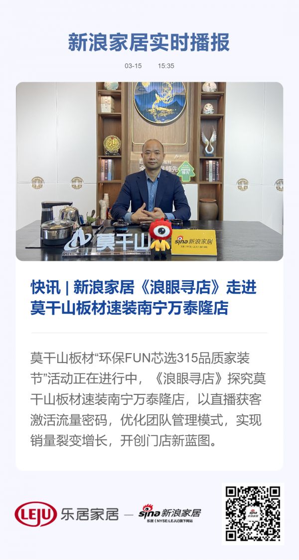 莫干山板材“环保FUN芯选315品质家装节”活动正在进行中,《浪眼寻店》探究莫干山板材速装南宁万泰隆店,以直播获客激活流量密码,优化团队管理模式,实现销量裂变增长,开创门店新蓝图。