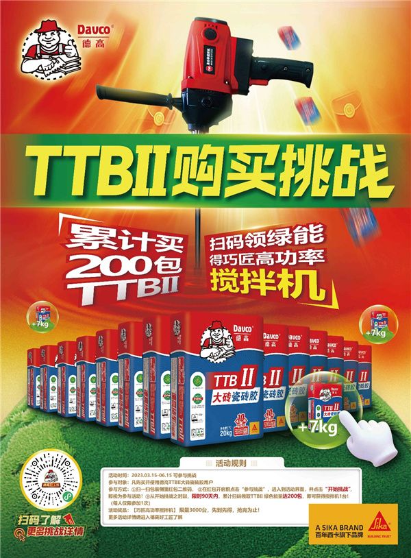 焕新3月,德高TTBI瓷砖胶与TTBII瓷砖胶惊喜升级,两款人气产品不仅通过“中国环境标志”认证,法国“A+”室内环境检测,还符合欧盟REACH法规且获得德国莱茵TÜV权威认证。多重环保高标准加持,再次凸显其超硬核实力!除此之外,德高TTBII购买挑战赛也重磅上线,3000台巧匠高功率搅拌机,等着各位来赢取!