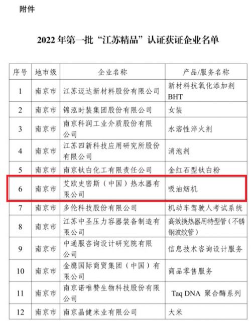 A. O.史密斯「瀞」油烟机荣获 “江苏精品”认证