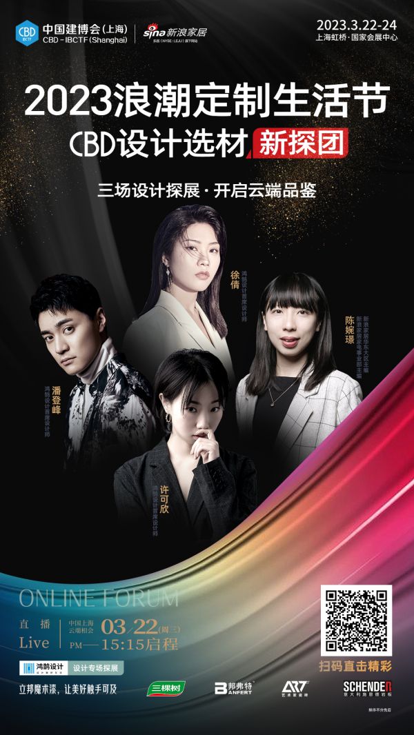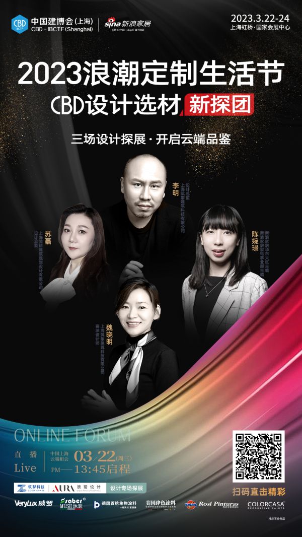 3月22日,2023中国建博会(上海)将在虹桥国家会展中心揭开帷幕。新浪家居将携手九位设计大咖组成2023浪潮定制生活节CBD设计选材新探团,第一视角与你共看家居空间设计选材新风尚,探索行业最新动态,欢迎扫码观看直播。