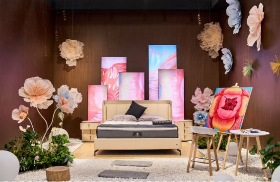 这一区域也同步展示了Simmons®席梦思与当代独立艺术家杨婉合作推出的“梦唤新生”艺术跨界合作作品,演绎“以好眠唤醒感官、唤醒精彩生活”的乐活主张。整体的画作采用粉、橘、红为主色调,通过积极明亮、层次丰富的春日色彩,融合“梦境”和“新生”的概念,为观众带来一场充满生命力的感官盛宴。
