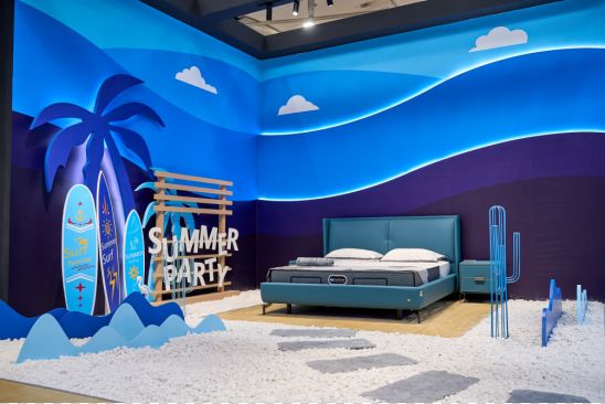 在活力无限的夏日主题展区, 海滩的清新氛围与冲浪元素的动感魅力相结合,以海天相接的蓝色渲染,布置了沙滩、海浪、冲浪板等元素,营造出虚实交织的清新空间,吸引了众多年轻客群沉浸式探索全新睡眠概念空间的无尽魅力。