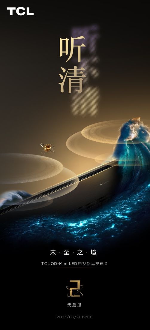 而在倒计时第2天的海报中,大字被换为了“听清”,单从字面意思上解读,应该就是电视的声音效果可以让我们能听得更清楚,而上面的浪潮可以说是汹涌澎湃,据此推测应该是此次TCL X11G将会在电视的音质表现方面带来显著的升级。