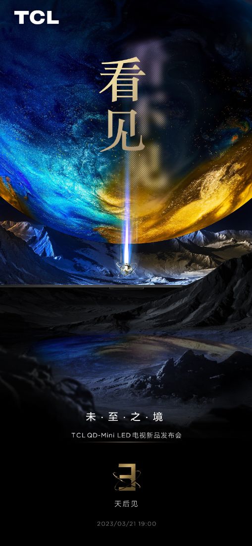 在第一天的预热海报中,“看见”的大字比较突显,而“看不见”三个字则是若隐若现,这应该预示着TCL这款新品电视相比以往获得了更能“看见”的能力,那直观表现应该就是画质表现的升级了。