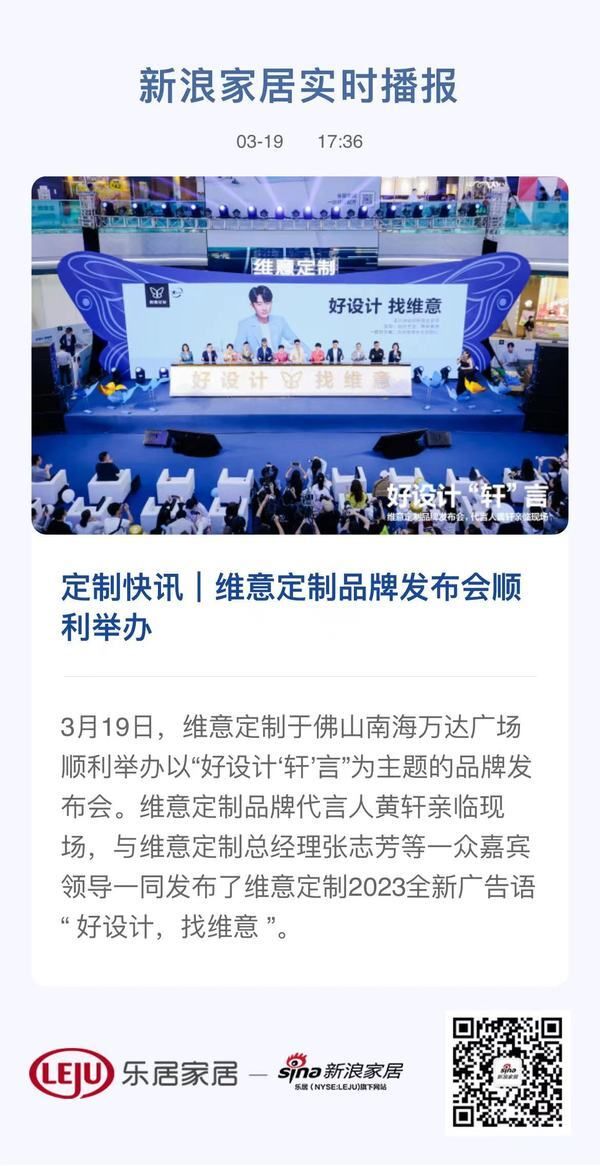 新浪家居定制频道讯3月19日,维意定制于佛山南海万达广场顺利举办以“好设计‘轩’言”为主题的品牌发布会。维意定制品牌代言人黄轩亲临现场,与维意定制总经理张志芳等一众嘉宾领导一同发布了维意定制2023全新广告语“好设计,找维意”。
