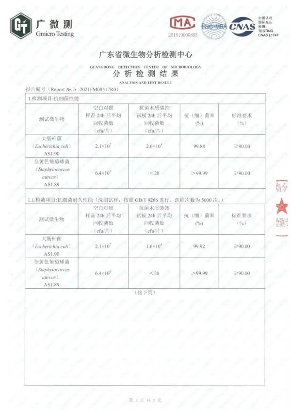 莫干山清醛除菌生态板2.0,在原生态板的结构上增加了清醛除菌层。于表面融入纳米硅钛,以分子筛结构在板材表面形成保护罩阻碍细菌滋生,对大肠杆菌、金黄色葡萄球菌等细菌有杀菌功效,细菌抑制率高达99%以上。