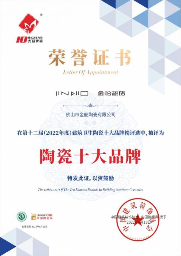 金舵深耕瓷砖领域三十年之久,对于产品有着质美如一的追求。到目前为止,金舵瓷砖建立了先进的生产线和严格的生产标准体系,可以确保每一件产品出品即精品。凭借出色的产品和口碑,金舵也相继获得了“陶瓷十大品牌”、“设计师推荐品牌”、“佛山标准产品”、企业标准“领跑者”等一系列荣誉认证。