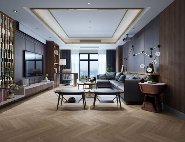 “人字拼”地板顾名思义就是铺装效果与我们汉字的“人”字相似。一般地板以90°进行拼接,形成人字一撇一捺的造型结构。这样的拼接方式可以让整体空间视觉上更具立体感,同时提升整体空间的美感。这样的拼花方式在很多空间中适用性都很强,尤其是大面积空间。在宽敞的客厅人字拼地板可以让空间的立体效果更强,达到修饰的效果,提升空间的辨识度和艺术感。