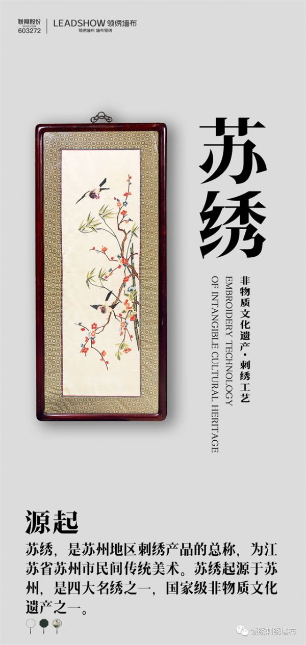 中国的手工刺绣工艺自虞舜之时起,兴盛于唐宋,蓬勃于明清,在漫长的发展过程中,技法不断精进,表现手法不断丰富,并演化成多姿多彩的风格。民间刺绣的风格更是千变万化,先后出现了苏绣、湘绣、蜀绣和粤绣“四大名绣”。以刺绣墙布起家的领绣墙布,如今已经成为A股上市企业,以苏绣匠心工艺融合东方哲思元素,穿针为笔,展绢为纸,引丝为色,领绣刺绣墙布将古典与潮流碰撞,不断在跨界融合中探索出刺绣现代潮流新玩法。
