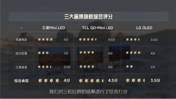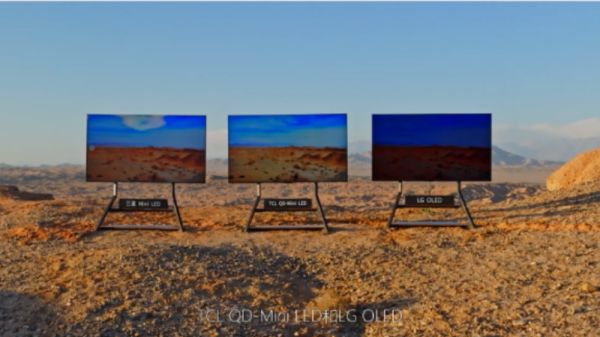 在极果网的测试中,主要是将QD-Mini LED电视TCL X11G和两台韩国的旗舰产品:三星Mini LED电视、LGOLED电视在画质和音质表现方面进行了对比。像是在对比高亮的画面场景时,得益于5000nits的超高峰值亮度,以及5000万:1的超高对比度表现,TCL X11G 在光影细节表现上相比三星和LG而言能够更加还原自然风光的样貌与颜色,做到如肉眼所见一般的真实,这方面也确实是OLED先天的劣势,因为OLED屏幕像素点自发光的原理,如果单像素的表现过亮,就很容易加快烧屏的风险,所以现阶段的OLED电视目前都没有很高的亮度表现。