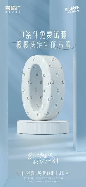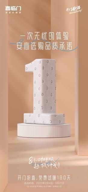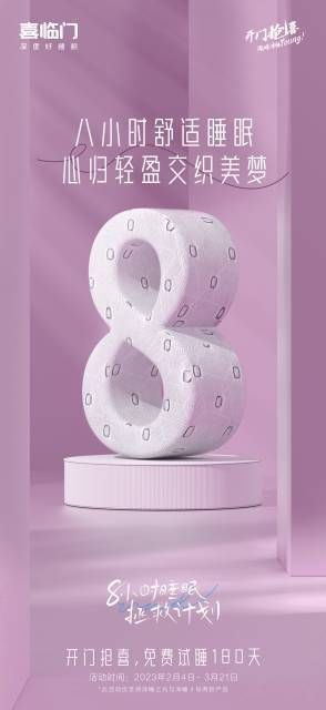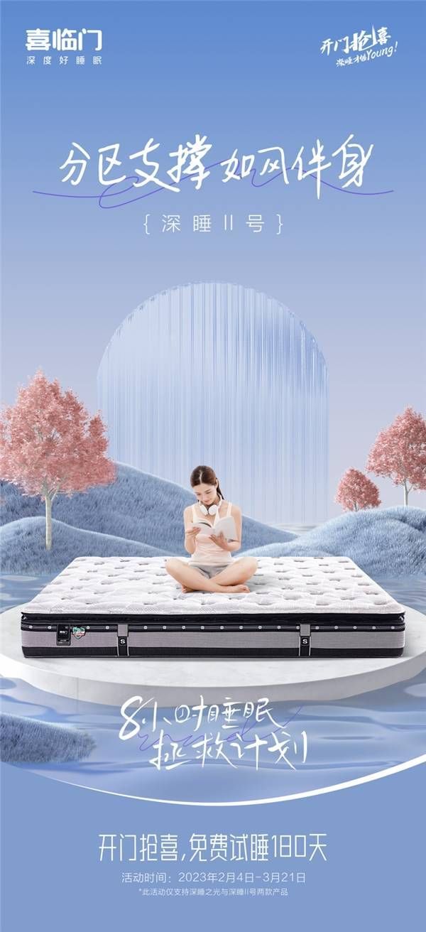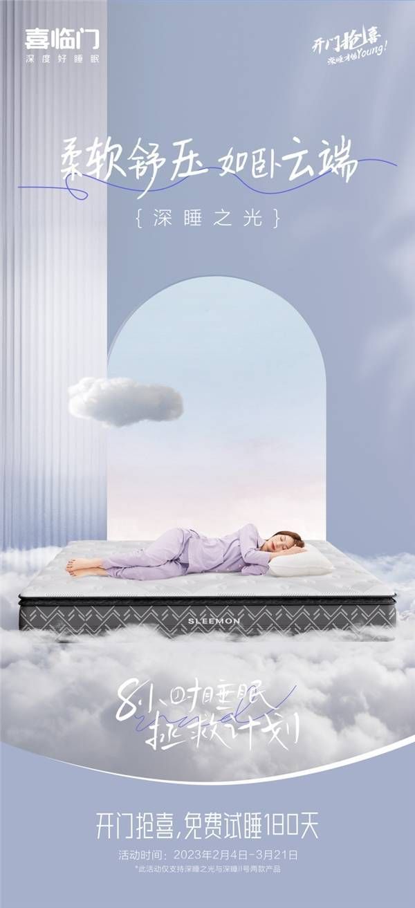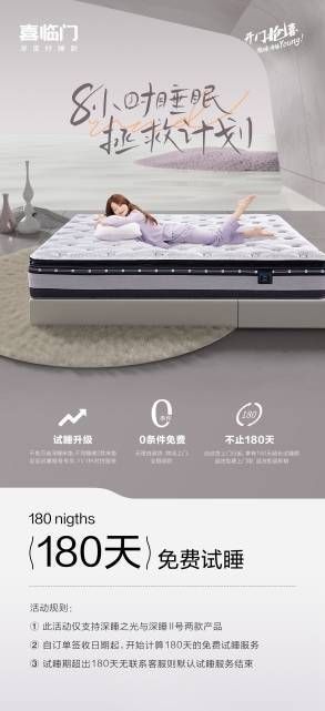 喜临门精准洞察到用户的需求点,专注深睡科技,致力于解决睡眠问题的同时,也更加关注人们对美好生活和健康睡眠的追求,希望可以通过自己的一份力为用户解决”选择合适的床垫“这一难题,让好睡眠没有“试错”成本。因此在开门红的大促活动中,喜临门以“开门抢喜 深睡才够Young”为主题,“0条件180天试睡”为核心利益点,发起“8小时睡眠拯救计划”,通过增长试睡周期,真正让消费者选到适合自己的产品,实现深度好睡眠。这不仅是对国人健康睡眠的深度关注,更是正面体现出喜临门过硬的产品力。