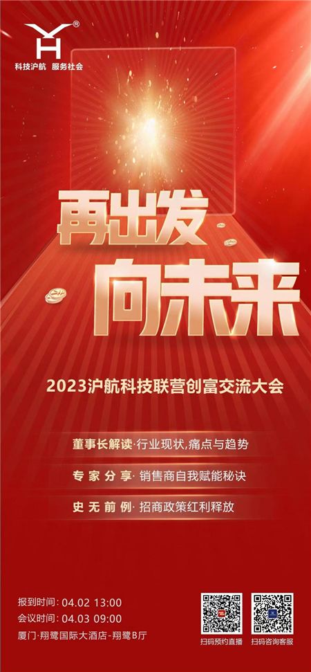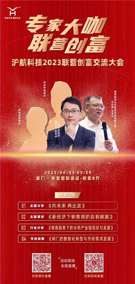 向未来,再出发!4月3日9:00,中国阀门领先企业沪航科技将正式打响品牌招商第一枪!2023沪航科技联营创富交流大会即将开启,并带来2023年不容错过的新财富商机!