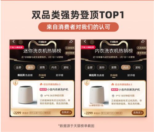 多年的研发及坚守得到市场的认可。在2023年38大促期间,仅上市不到半年的小吉内裤洗衣机强势登顶天猫“迷你洗衣机热销榜”和“内衣洗衣机热销榜”,双品类榜单。未来,小吉将不忘初心,始终将消费者需求放在首位,不断强化自身的产品力,提升消费体验。