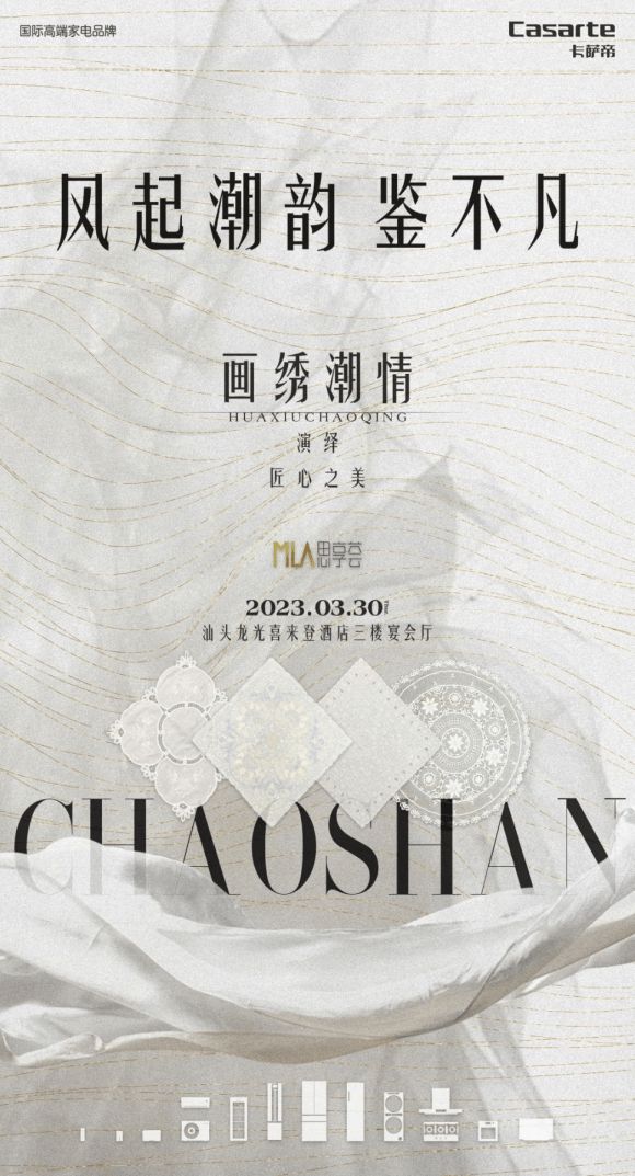 3月30日,在汕头市商务局的指导以及汕头市装饰行业协会、汕头市家居行业协会的支持下,一场主题为「风起潮韵 鉴不凡」的卡萨帝潮汕思享荟将会在汕头龙光喜来登酒店3楼重磅开启。届时,嘉宾们将透过精彩的节目表演走进潮汕,活动全程更有卡萨帝&三翼鸟全屋智慧场景现象级呈现,让大家感受卡萨帝智慧生活与潮汕文化的碰撞。
