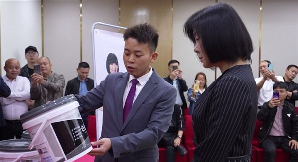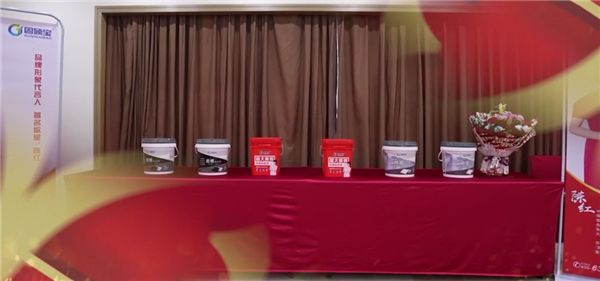 在固硕宝家人的掌声以及尖叫声下,陈红老师来到固硕宝产品展示台,固硕宝商学院院长陈冠鑫为其简单介绍了:超大板砖粘结剂、地面粘结剂、岩板粘结剂三款重磅产品,阐释了固硕宝“贴砖更安全”的产品优势。