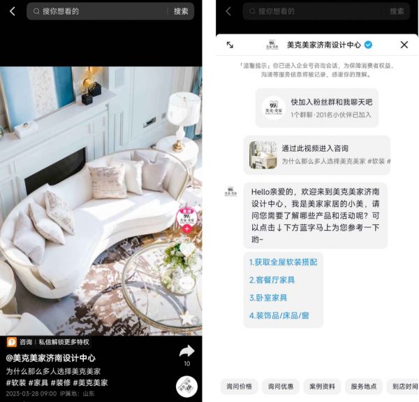 为实现更高效的线索承接,美克美家还借助平台的各种自动化技术,打造线索转化闭环。美克美家在私信中单月可获取留资3000+,用户的兴趣与转化意愿也在互动中不断加深。