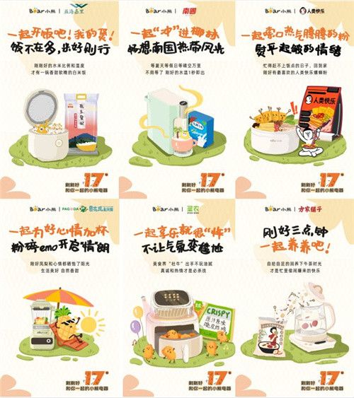 春光正好,享受当下,即为美好。这也是小熊“刚好一起”17周年庆的主题想法。饥肠辘辘时,刚好有饭香扑鼻;想吃的食材太多,刚好组个火锅局。许许多多的刚好,也是生活的灵感在冒头。一个年轻的品牌,不仅要有年轻的调性,更要懂得如何打动年轻人,刚刚好,和你一起的小熊电器。