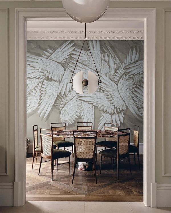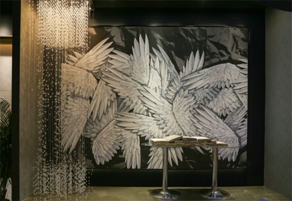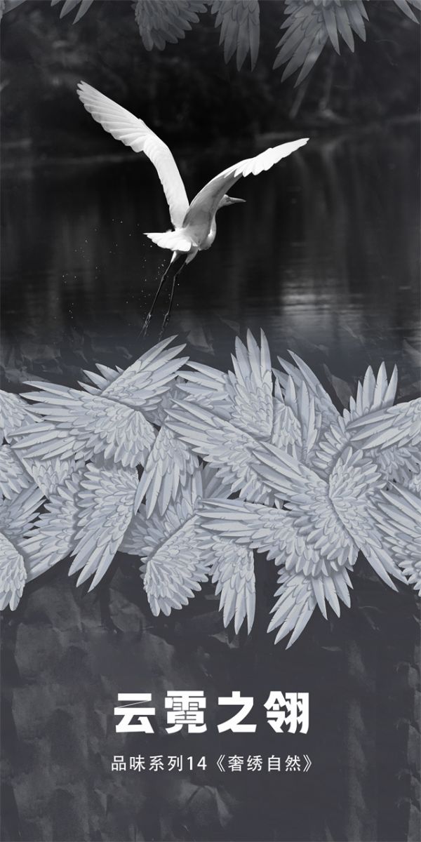 「云霓之翎」是品味系列14-《奢绣自然》中的花型,也是本次北京展会中所展示的新品,似琉璃般的串珠与剪纸艺术表现形式融合在一起,予人如梦似幻般的空间体验。