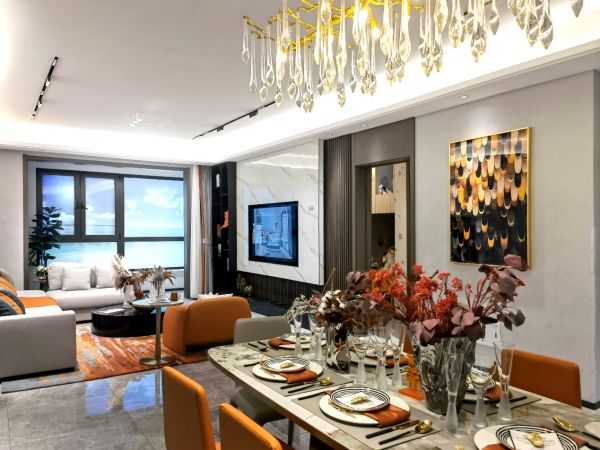 南向三面宽户型格局,提升空间采光和通风效果;时尚跳跃的橙色为空间带来活力。通过墙饰面材料肌理感的明显不同,实现了餐厅与厨房的串联与分割,灵活塑造出空间韵味。