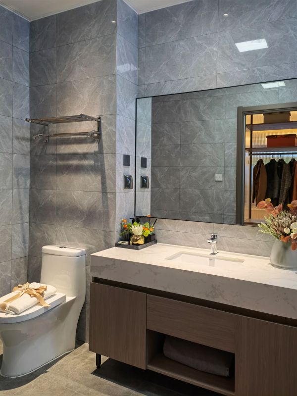 主卫采用华耐智装整体卫浴产品,底板使用SMC防水底盘,表层铺设哑光瓷砖,时尚内敛;壁板采用瓷砖复合墙面,工厂化一次性成型,防水易清洁。整体设计小巧精致,功能俱全,不仅最大程度利用卫生间空间,而且无卫生死角,并且具备抑菌的功能。