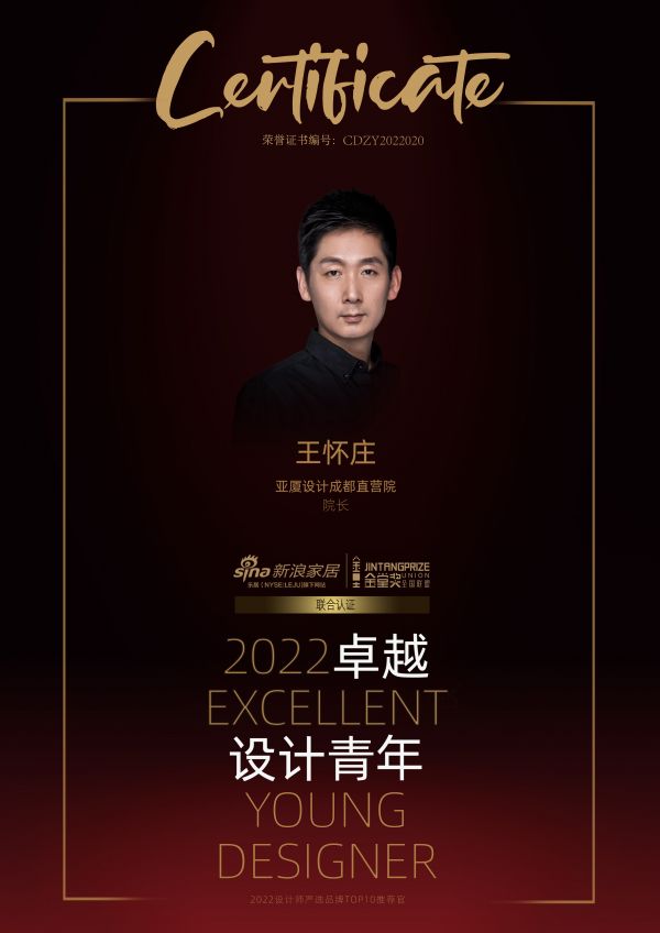 2022卓越设计青年”由新浪家居和金堂奖全国联盟发起,是设计业界最具传播价值的年度先锋荣誉,新浪家居与金堂奖联名认证。旨在发掘和表彰室内设计领域表现卓越的杰出青年设计师。设计师王怀庄荣膺“2022卓越设计青年”称号。