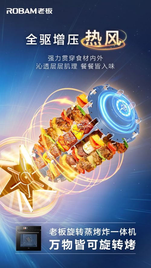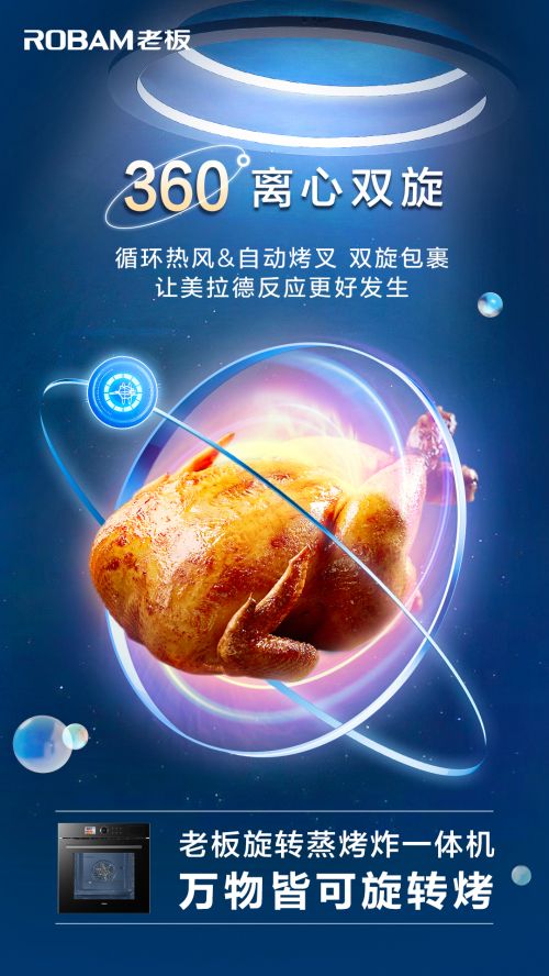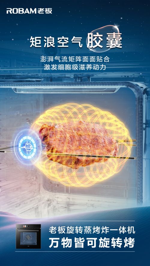 如果说蒸烤炸一体机在社交厨房中让沟通更进一步,那么旋转烤功能的加入则让烹饪料理再上一个台阶。老板旋转蒸烤炸一体机CQ925全面升级“烤”功能,使食材处于悬空、旋转状态,并在矩浪空气胶囊、360°离心双旋、全驱增压热风三项核心科技的加持下,将食材的烘烤性能发挥到极致。