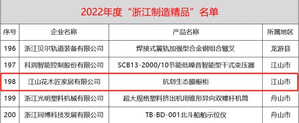 近日,由浙江省经济和信息化厅组织的2022年度“浙江制造精品”名单揭晓。江山欧派旗下子公司——江山花木匠家居有限公司(简称:花木匠)创新研究的“抗划生态膜橱柜”,顺利通过认证审核,荣获2022年度“浙江制造精品”,为“浙江制造”贡献欧派力量!