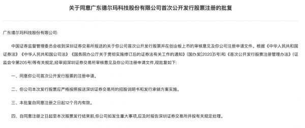 3月22日,广东德尔玛科技股份有限公司(以下简称:“德尔玛”)深交所创业板IPO注册获证监会同意,预期德尔玛不久将将刊登招股资料,启动股票发行工作。