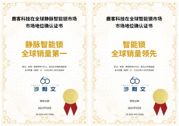近日,鹿客获得全球最大的企业增长咨询公司弗若斯特沙利文(简称沙利文)颁发的两份市场地位确认证书:智能锁全球销量领先和静脉智能锁全球销量第一,此番权威认证再次确立了鹿客作为中国智能锁品牌的市场领导地位。