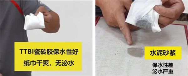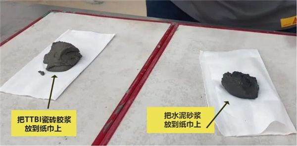 我们将定量的TTBI瓷砖胶浆及水泥砂浆放到纸巾上,观察纸巾的干爽情况,来感受两者的保水性能。