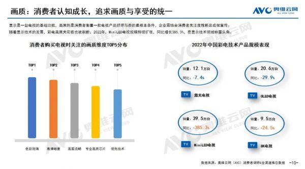在产品尺寸上,大尺寸成为了电视行业的主流。2022年大尺寸化快速发展,其中增长最快的是75英寸,较去年同期增长了6.1个百分点;85英寸产品市场份额为2.6%,较去年同期增长了1.6个百分点。技术方面,Mini LED电视通过亮度和分区的不断增加,对比度和细节呈现大幅提升,同时不存在OLED的烧屏问题,被认为是未来大屏的主流技术。