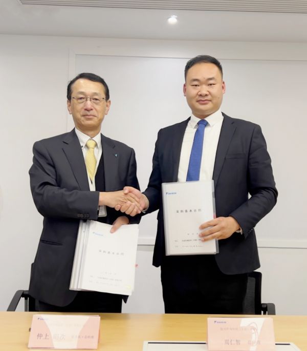 大金空调技术(中国)有限公司董事长兼总经理仲上昭次与链风环境科技(上海)有限公司总经理周仁智共同出席并正式签订了协议。