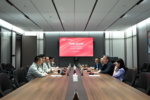 3月30日, 德国HOPPE 好博董事会成员,亚太区总裁 Eric Kersten先生携华南区销售负责人等拜访新豪轩门窗,参观新豪轩佛山富力展厅及办公区域,并与新豪轩门窗CEO冯佐星先生,综合中心总经理冯文生先生,采购中心总经理冯佐铭先生以及相关人士进行会议交流。