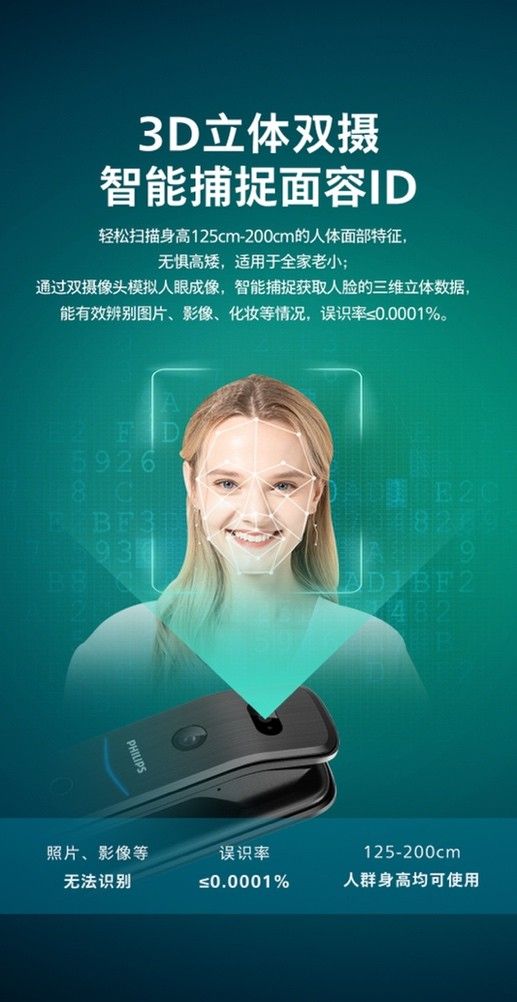 有了人脸智能锁,人脸就是“钥匙”,现代人出门将毫无压力。飞利浦DDL709-FVP采用商汤双目识别技术,内置AMS传感器,当人们靠近门锁1m范围内时,主动式雷达将唤醒人脸识别模块工作,无需更多操作,刷脸就能开门,非常之快;通过双摄像头模拟人眼成像,飞利浦DDL709-FVP能够智能捕捉获取人脸的三维立体数据,无论化妆、戴眼镜等都能轻松识别,还能有效杜绝人像照片、录影等假象,非常之准。无论何时,用户都能放心出门而无后顾之忧。