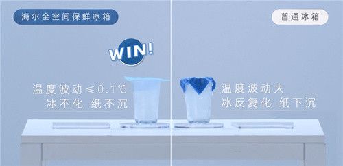 冷冻室温度是否波动,是造成两张餐巾纸巨大差异的主要原因。海尔全空间保鲜冰箱的冷冻温度波动≦0.1°C,冰杯不会反复化冻,纸巾始终干燥;而普通冰箱冷冻温度波动大、温差大,所以导致冰块反复化冻,纸巾浸湿下沉。