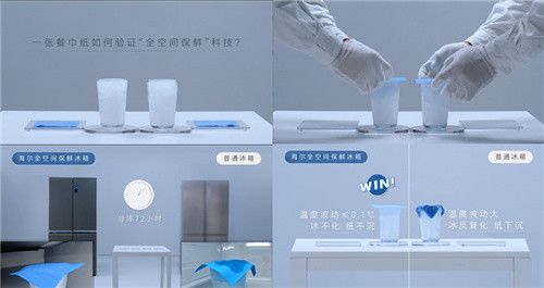 视频中,实验人员将餐巾纸放在两杯相同的冰上,并分别放入海尔全空间保鲜冰箱和普通冰箱中。经过72小时的冷冻,从海尔全空间保鲜冰箱中拿出的餐巾纸依旧平整如初;而普通冰箱里的餐巾纸已被浸湿,覆盖在杯口的部分明显下沉。
